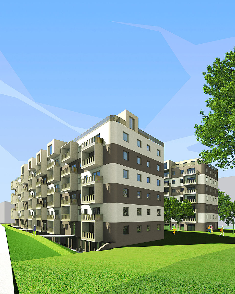 Das Projekt mit einer Wohnnutzfläche von rund 10.000 m² umfasst 110 geförderte Mietwohnungen mit Eigentumsoption. Die Wohnungsgrößen variieren zwischen 60 und 106 m². Die Geschosswohnungen zeichnen sich durch flexible Mitgestaltungsmöglichkeiten und großzügig dimensionierte Wohnküchen mit davorliegenden Freiräumen wie Loggien, Balkonen und Terrassen aus. Alle 2 Wohneinheiten werden durch natürlich belichtete Stiegenhäuser erschlossen. Die Querdurchlüftung jeder Wohnung sichert einen hohen Wohnkomfort. Die beiden parallel situierten Baukörper entlang der Straße und entlang des im Süden gelegenen Parks werden durch einen großzügigen Grünraum verbunden. Diesen durchzieht ein leicht terrassierter Hügelzug, der mit seinen lockeren Baumpflanzungen Distanz zwischen den Baukörpern schafft und den Erdgeschoss- Wohnungen Intimität sichert.