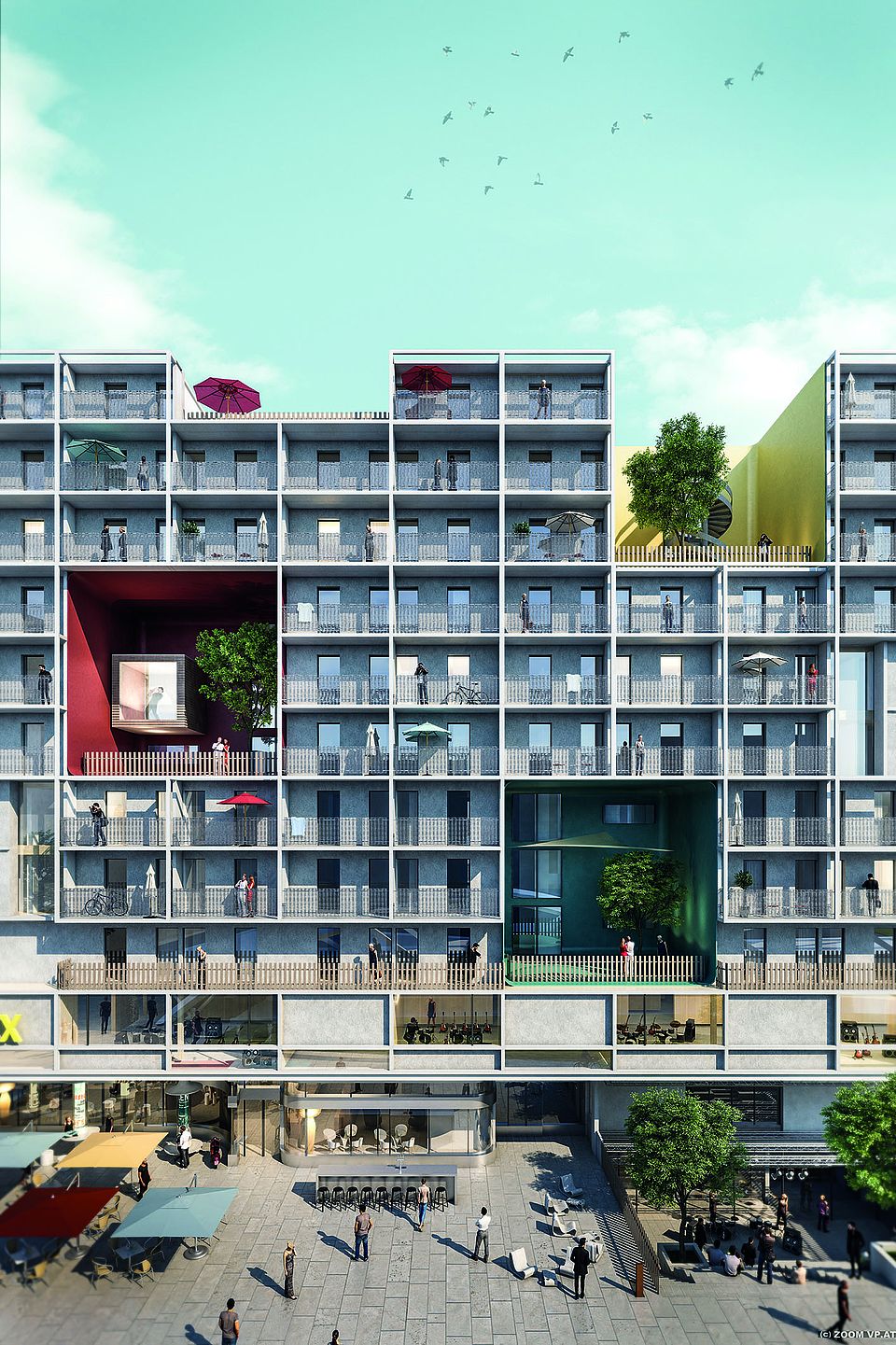 In der Sockelzone liegt dem Nutzungskonzept die Schaffung von Bewegungs-, Kultur-, Service- und Informationsangeboten sowie von Flächen für die Kleingastronomie zu Grunde. Im Unter- sowie Erd- und 1. Obergeschoß werden Flächen für beatboxx - Verein zur Förderung von Musik - realisiert, in welchen sich auch entsprechende Proberäume wiederfinden. Zudem werden ebenerdig die Grätzl-Zentrale, ein Creative Lab (das auch von der Sport Union genutzt wird) sowie ein 24h-Shop (gekühlte Anlieferboxen) zu finden sein. Die übrigen Flächen, in den oberen Stockwerken, bilden private Wohnbereiche, deren primäre Zielgruppe (inter-)nationale MusikerInnen sind, die in Wien studieren, arbeiten oder auftreten. Diese werden in zwei unterschiedlichen Konzepten umgesetzt: In Form von room4rent Serviced Apartments und dem grätzlhotel.