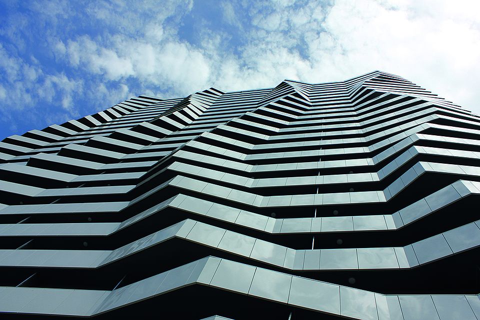 Der vom Architekturbüro querkraft entworfene 85 m hohe Leopoldtower begeistert mit seiner außergewöhnlichen Gestaltung. Die unterschiedlich auskragenden Loggien und Balkone entlang jedes Stockwerkes umhüllen die Fassade und verleihen dem Tower sein unverwechselbares und fließendes Erscheinungsbild. Jede Wohnung verfügt über Freiflächen in Form von Loggien oder Balkonen.